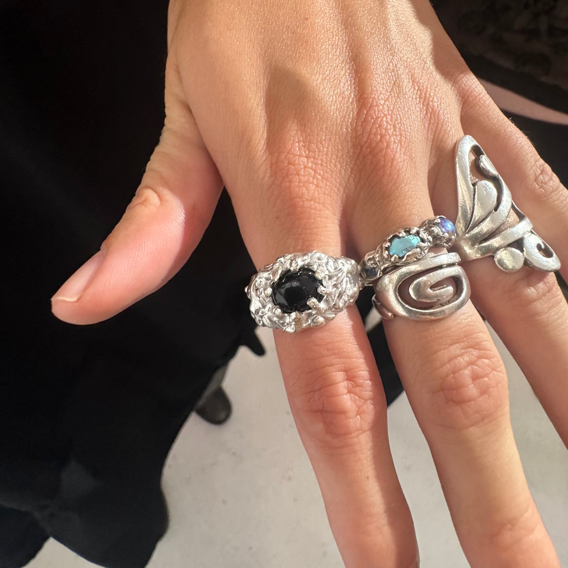Ah This is one of my favs! 925 sterling silver, organic texture band with statement Onyx stone and 2 milky white lab-grown gems set in place.